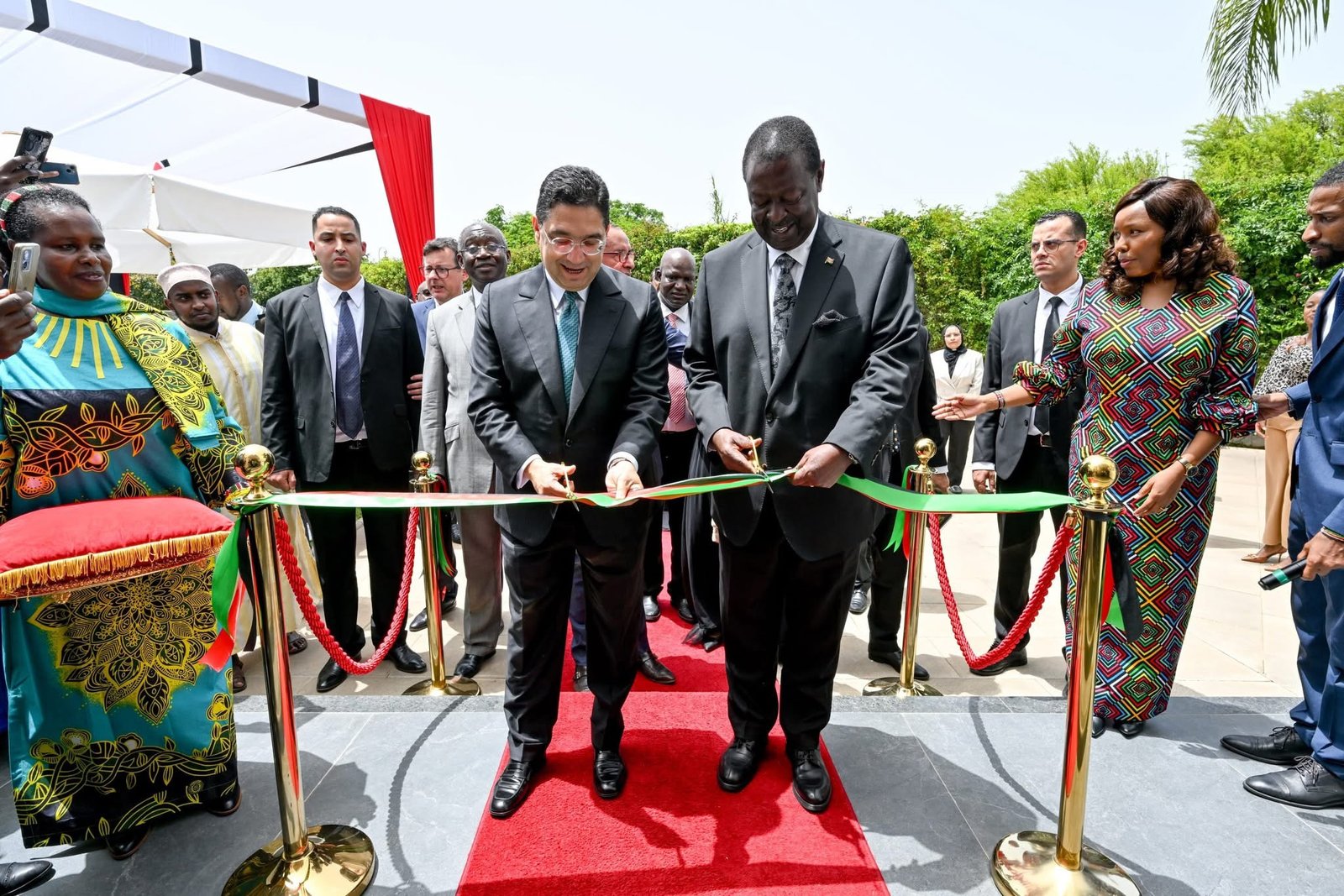 أشرف وزير الشؤون الخارجية والتعاون الإفريقي والمغاربة المقيمين بالخارج، السيد ناصر بوريطة، ورئيس مجلس الوزراء ووزير الخارجية وشؤون المغتربين لجمهورية كينيا، السيد موساليا مودافادي، اليوم على مراسم تدشين مقر سفارة جمهورية كينيا بالعاصمة المغربية الرباط.