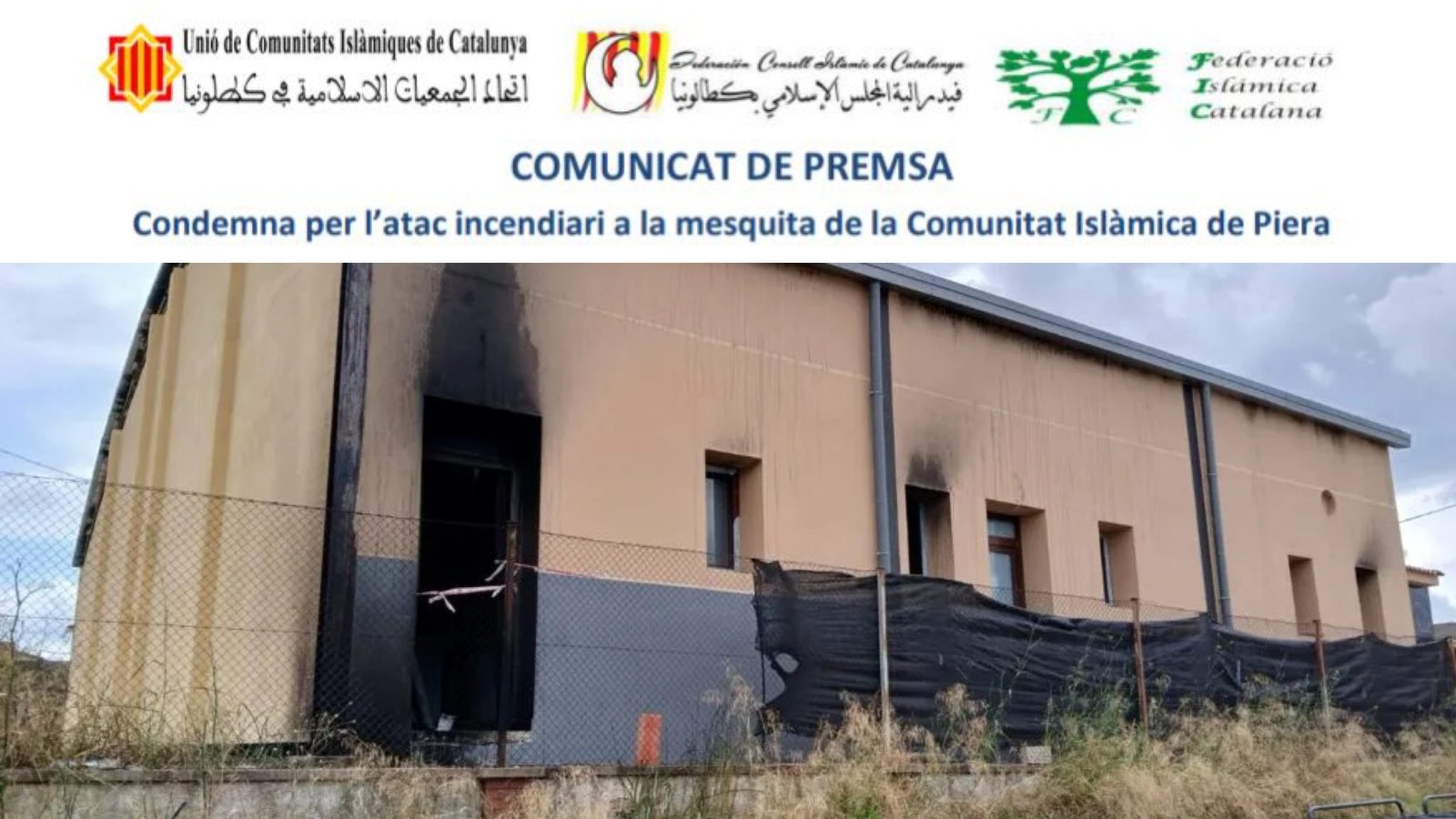 أصدرت الفيدراليات الإسلامية الثلاث في كتالونيا (UCIDCAT، FCIC، وFIC)، إلى جانب عدد من الهيئات الممثلة للجاليات المسلمة، بيانًا مشتركًا يوم السبت 12 يوليو 2025، تدين فيه بشدة الاعتداء الإجرامي الذي طال مسجد الجماعة الإسلامية في بلدة بييرا.