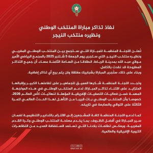كما عبّرت اللجنة عن تقديرها الكبير للجماهير المغربية على مساندتها الواسعة وحماسها المتواصل لدعم “الأسود”، لاسيما في هذه المرحلة الحاسمة من التصفيات الإفريقية المؤهلة إلى كأس العالم 2026، حيث يقترب المنتخب الوطني من حسم بطاقة التأهل للمرة الثالثة توالياً والسابعة في تاريخه.