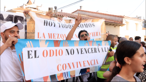 Durante la concentración se alzaron consignas claras contra el racismo, entre ellas: “No fue un incendio, fue un crimen de odio” y “Sí a la mezquita, no al odio”, en un ambiente marcado por el respeto, la serenidad y la participación notable de familias, jóvenes y personas mayores de la localidad.